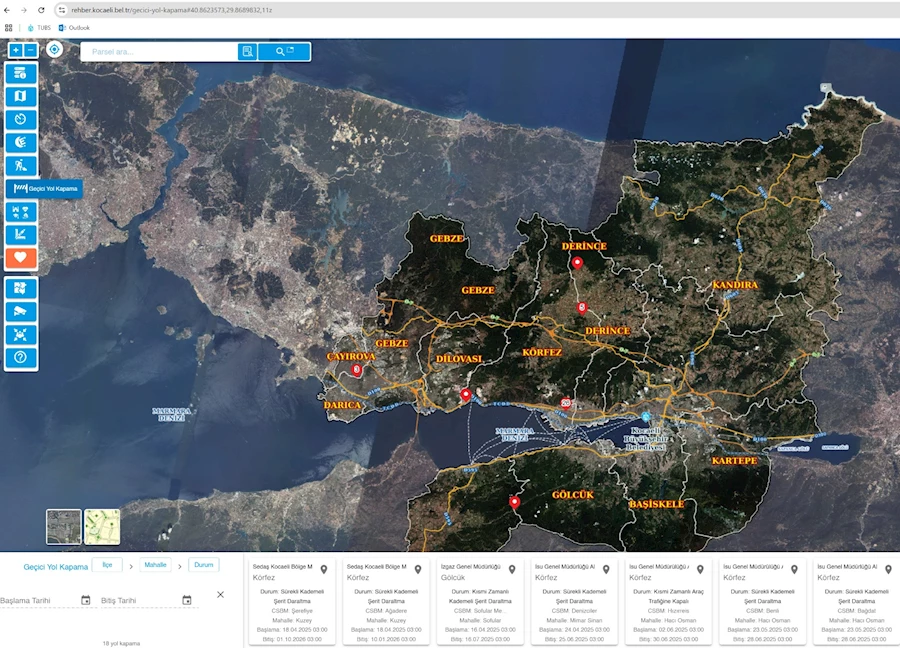 Kocaeli Büyükşehir Belediyesi, şehir genelinde UKOME izni alan, devam eden ve planlanan yol yapım, bakım, onarım ile altyapı çalışmalarını vatandaşların anlık olarak takip edebileceği yenilikçi bir sistemi hizmete sundu. Vatandaşlar, güncel çalışmaları E-Kocaeli ve rehber.kocaeli.bel.tr adresi üzerinden kolayca ulaşabiliyor.